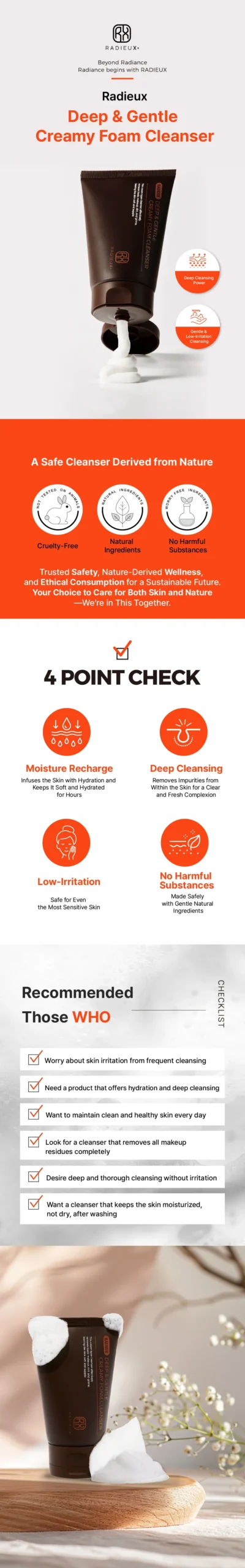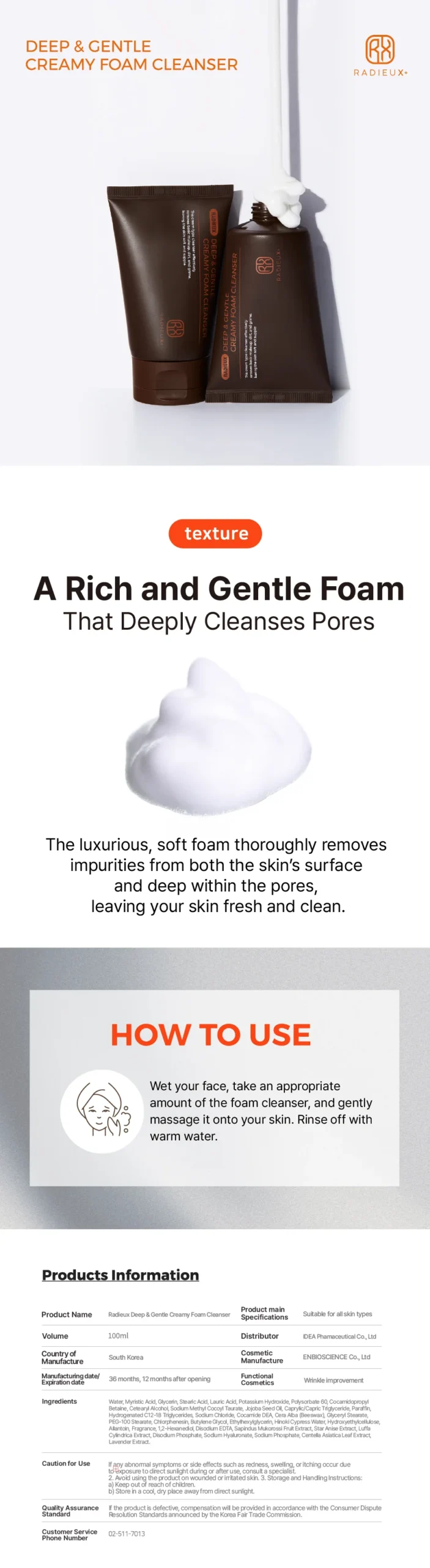 Radieux Renew Deep & Gentle Creamy Foam Cleanser ,es un limpiador facial cremoso que elimina suavemente impurezas y restos de maquillaje, proporcionando una limpieza profunda sin irritar ni resecar la piel.