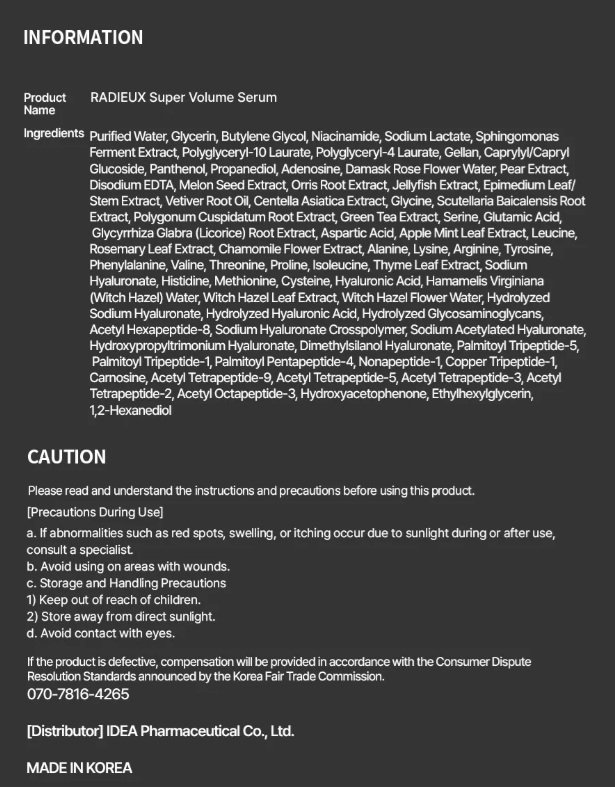 Radieux Renew Super Volume Serum con ingredientes activos para aportar volumen e hidratación profunda en piel apagada.